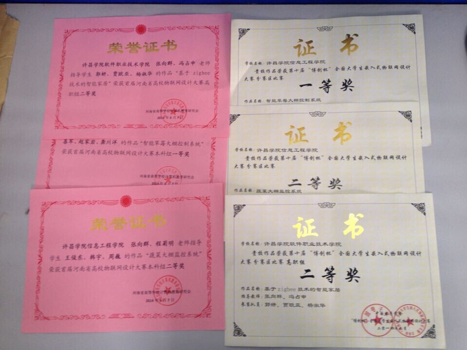 6月6日至7日,第十届“博创杯”全国大学生嵌入式物联网设计大赛(河南赛区)暨首届河南省高校物联网设计大赛在郑州轻工业学院举办。来自省内高校多支队伍参赛,我校共派出3支代表队参加了本次比赛并获佳绩。其中由张向群、王闯老师指导,姚喜军、赵家岩、龚川洋等同学设计的作品“智能草莓大棚控制系统”获得本科组一等奖;由张向群、程菊明、王闯、冯战申等老师指导,王俊东、韩宇、周巍等同学设计的作品“蔬菜大棚监控系统”、郭妍、贾欧亚、杨淑华等同学设计的作品“基于zigbee技术的智能家居”分别获得本科组二等奖、高职组二等奖。