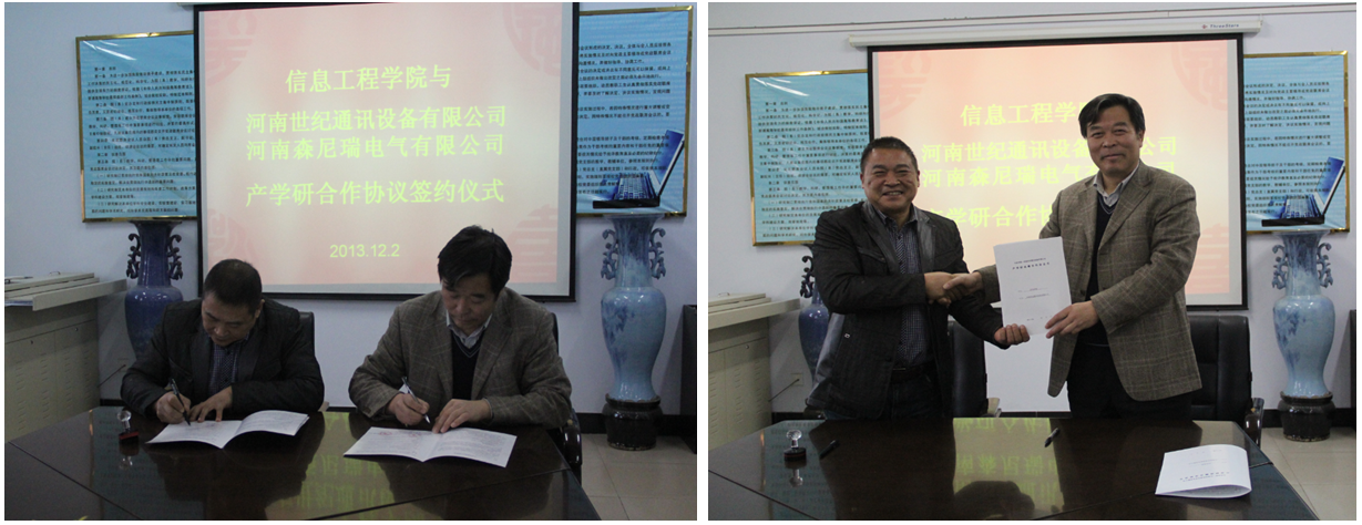 12月2日下午,我院与河南世纪通讯设备有限公司、河南森尼瑞电气有限公司进行产学研合作签字仪式在计科楼三楼会议室成功举行。院党总支书记郭超峰、院长张志立、副书记翟广辉、副院长冯战申等学院领导与河南世纪通讯设备有限公司副总经理郭林、河南森尼瑞电气有限公司总经理陈春华等企业代表参加了本次仪式。