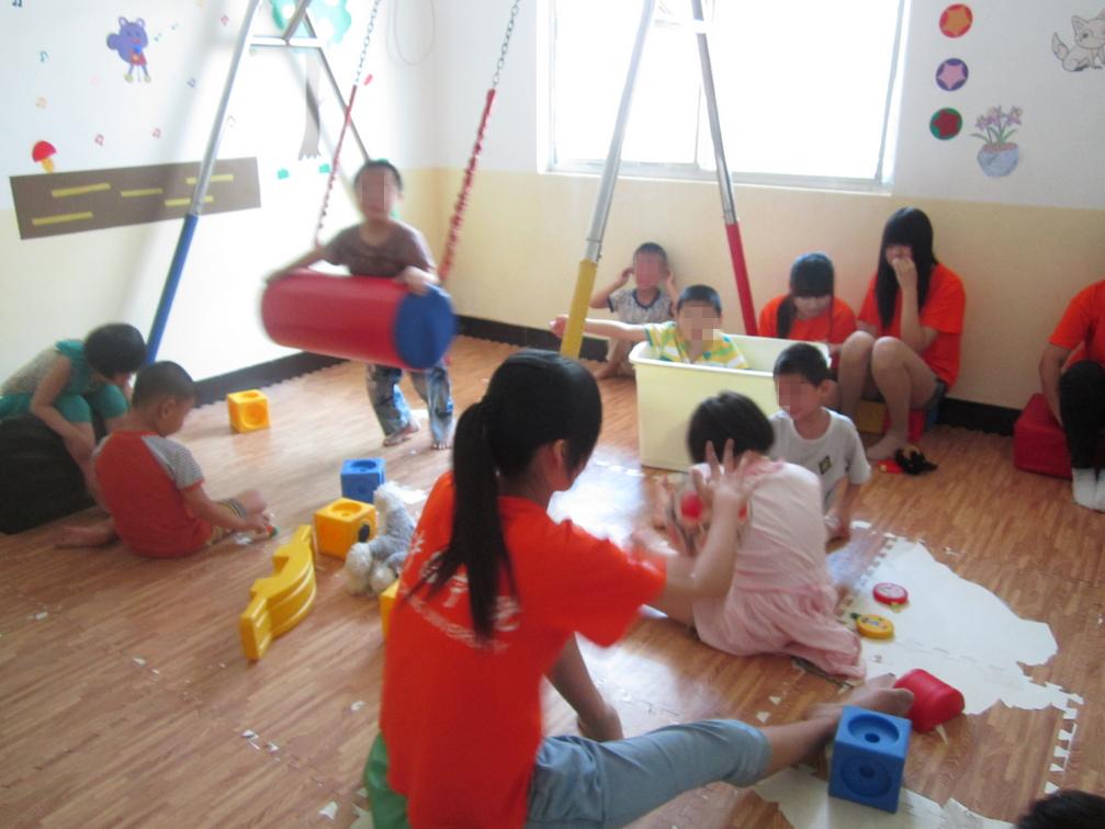 同时志愿者也认识到自己身上的责任重大。因为有的孩子本身问题和性格方面原因,户外活动必须由一个志愿者照顾一个孩子,有的比较特殊的孩子需要两个志愿者照顾。志愿者分了四个组,一组有6个志愿者。有一组志愿者特定的站在马路旁边看着孩子们,防止他们跑上马路;由于千亩游园旁边有一条河,所以有一组志愿者特定的站在河堤旁,防止有的孩子调皮去河堤那玩耍;剩下的两组陪着老师与孩子们玩耍,做一些简单的游戏。许昌今天的最高气温是30度,站在马路边和河堤旁的志愿者们脸上充满了汗水,但是当他们看见孩子们脸上灿烂的笑容时感觉一切的付出都是值得的。