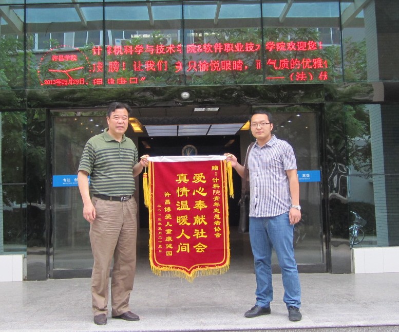 许昌市博爱儿童康健园此次赠送的锦旗是对我院青年志愿者协会最大的肯定与鼓励,相信我院青年志愿者协会的所有志愿者一定会更加努力,秉承“奉献、友爱、互助 、进步”的宗旨,更好的服务于社会,并将志愿者精神传递给更多人。