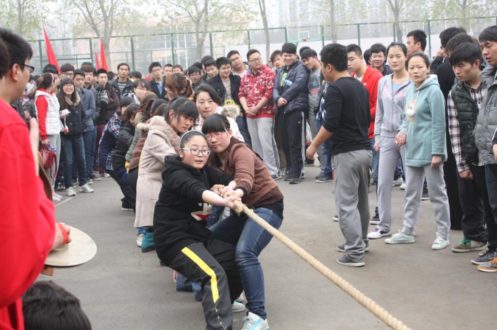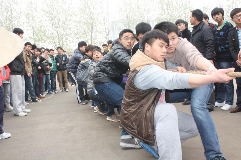裁判员发出“预备”口令后,队员们都半蹲后仰,攒足了劲头准备开始。只听一声哨响,拔河的同学脚紧紧地踏着地,身子往后仰着,拉拉队的同学拼命的喊着:“加油,加油......” 整齐的口号不仅帮助选手们齐心发力,也在气势上压倒对方。平时斯文的女孩子们,在比赛中也放下了“淑女风范”,用尽全力“拼杀”。在这短暂的时刻,各参赛队员都为一个共同的目标,进入忘我的境界。赛场上不断涌现出一浪高过一浪的欢呼声。经过多场鏖战,计算机科学与技术学院(软件学院)男生以第一名的成绩晋级,他们欢呼雀跃着,证实了“团结就是力量”这一牢不可破的真理。