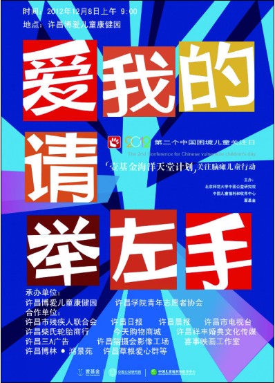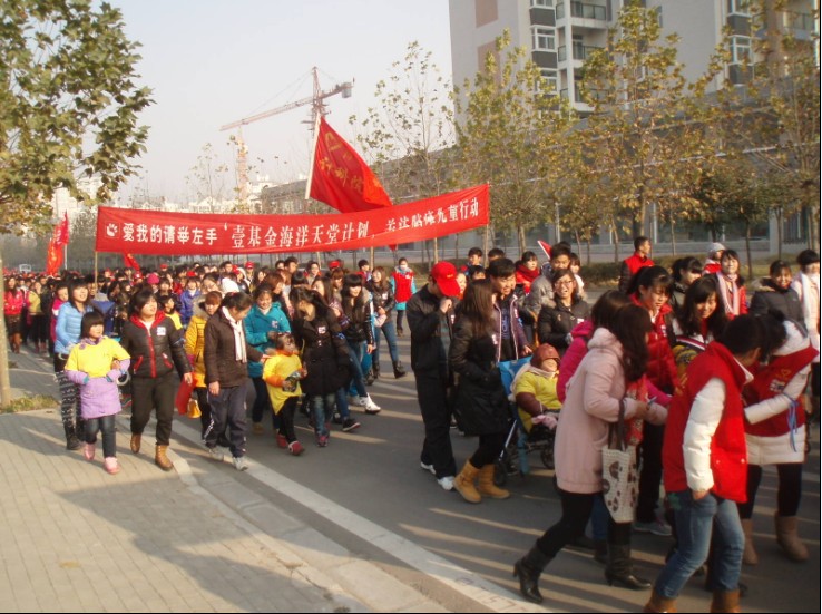 为了倡议设立困境儿童关注日,让更多的困境儿童得到关注,快乐成长,2012年12月8日,由计算机科学与技术学院&软件学院青年志愿者协会发起,联合八大院系青协,联手许昌市博爱康健园举行了壹基金之“爱我的请举左手”——牵手脑瘫儿童暨困境儿童公益嘉年华活动在许都广场隆重举行。参与此次活动的还有社会各界人士。