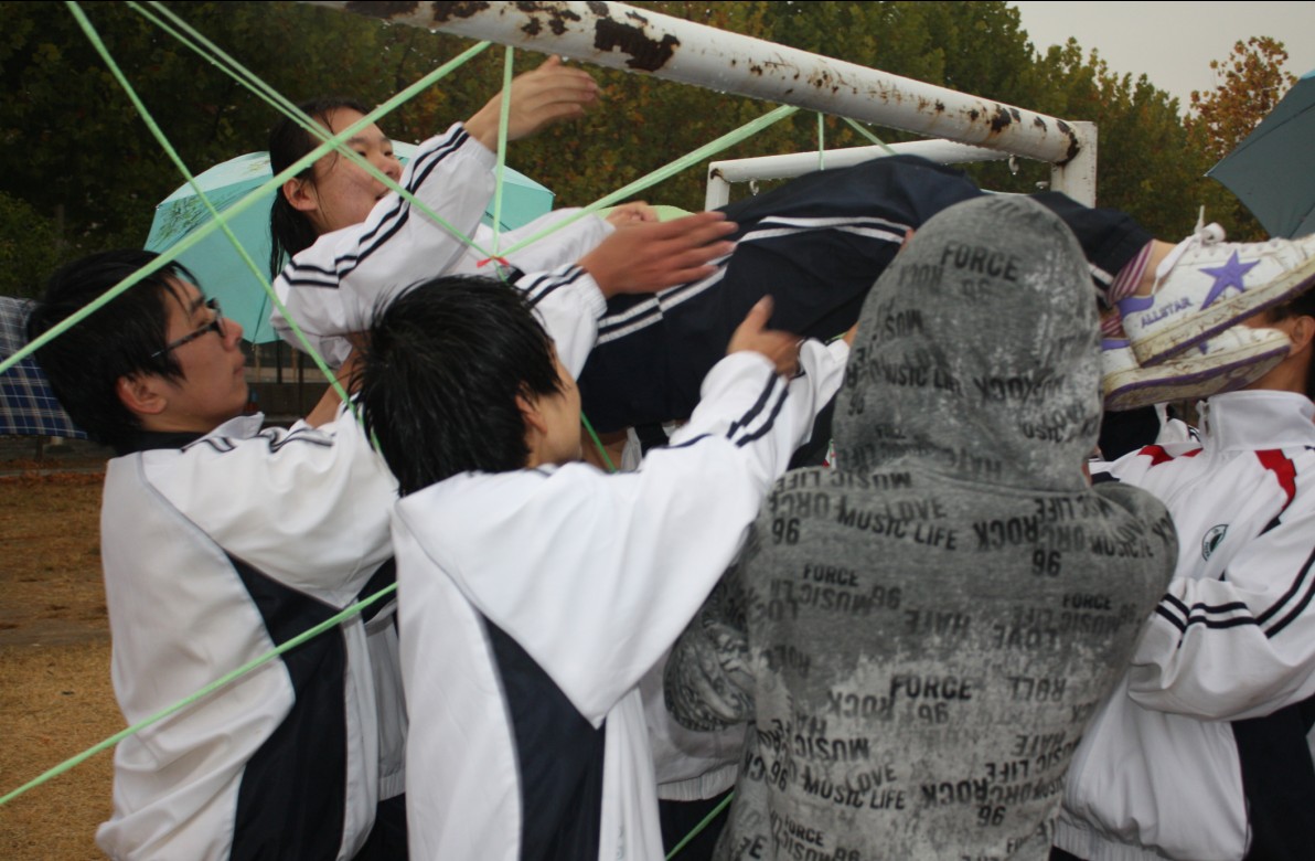 随后,以小组为单位,以小组间队员团结合作为基础,开展活动。有背靠背站立、袋鼠跳、两人三足、雷区取水、穿越电网等游戏。同学们全然不顾大雨的冲刷,在协作与帮助中体验着快乐。中午,同学们在计科楼IT大课堂和311报告厅集体就餐。下午,雨过天晴,活动更加精彩。在信任背摔、攀爬毕业墙中,身强力壮的男同学甘当人梯,在队友之间的团结互助中,同学们在声声呐喊中体验了奉献与付出。接下来是风雨人生路,一个盲人、一个哑巴,两人互相搀扶,一步步走过坎坷、泥泞的道路。短短一个小时的路程,使每个参与者都体会了信任与被信任的感动。晚上七点。活动结束,同学们聚集在教室里观看活动照片并回顾这一天的所感所得。