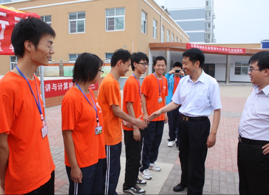 随后,王洪彬副书记一行又马不停蹄地赶往位于鄢陵县陈化店的新型农村社区——明义社区。6月25日以来,计科院(软件学院)的15名大学生们在这里义务进行“计算机知识宣讲及计算机维修”活动。王书记走到学生中间,热情地与学生握手,询问活动开展的情况。当得知活动开展三天以来,已为当地社区居民维修了近60台电脑,发放了600多份《电脑小常识宣传页》和《计算机使用情况调查问卷》时,王洪彬副书记十分高兴,并给予了实践活动高度评价。他希望大家再接再厉,充分发挥大学生的独特优势,为社区居民送去更多更优质的服务。王洪彬副书记还勉励同学们在实践中多学习,多向基层干部和群众学习,主动接受锻炼,在完善自我和提升自我的过程中自觉把理论知识与实践活动结合起来,为服务新农村和建设和谐中原做出自己应有的贡献。