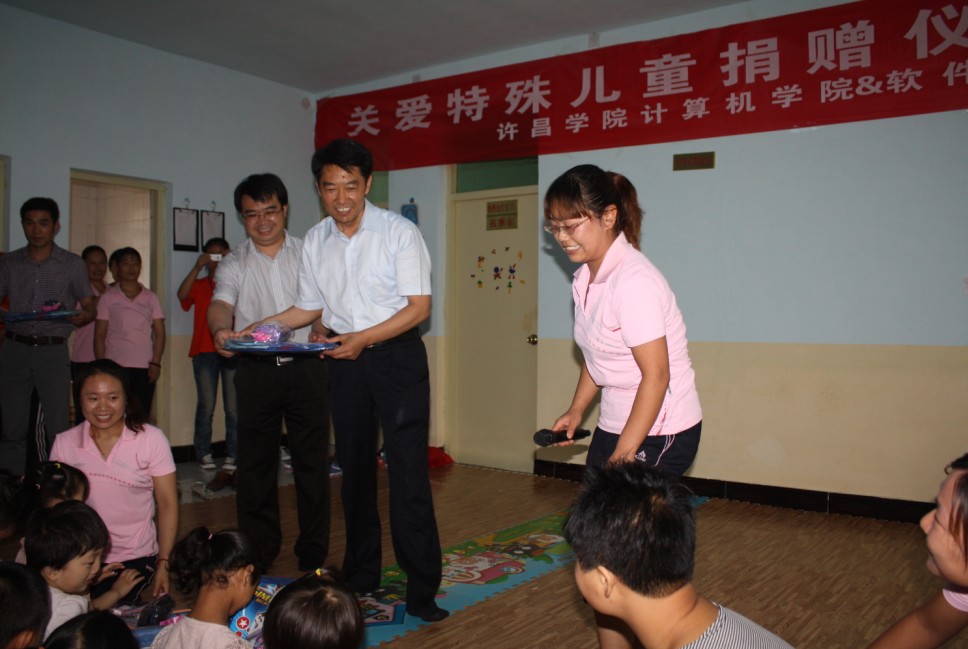 下午三点,王洪彬副书记带领慰问团首先来到许昌市博爱儿童康健园——一家专门接收心智障碍儿童(脑瘫、智障、自闭症等)进行特殊教育的社会公益机构。计算机科学与技术学院(软件职业技术学院)11名大学生正在这里进行“学雷锋、见行动、关爱特殊儿童”的实践活动。”王洪彬副书记与队员们进行了亲切交谈,详细询问了志愿活动进行的情况,并语重心长地告诉大家:“儿童是祖国的未来,这其中当然包括特殊儿童,你们帮助这些孩子进行康复训练和早期文化教育,是用实际行动表达对他们的爱护。希望通过更多类似的活动,能够唤起社会对特殊儿童更多的关注”。之后,王洪彬副书记参加了计科院(软件学院)为博爱儿童康健园举办的爱心捐赠仪式,并给他们送上文具、书包等学习用品,表达了我校对特殊儿童的关爱。