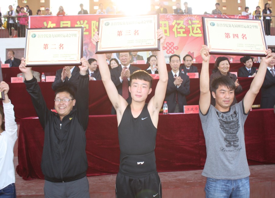 国歌奏响,国旗升起,第六届运动会闭幕式正式拉开序幕。首先,主持人宣布获奖院系及个人。随后,校领导对此次运动会的成功举办表示祝贺,他说运动会不但展现了同学们意气风发的风采,还提高了同学们的综合素质,充分展现了同学们坚强的毅力和不怕苦不怕累的执着精神,希望同学们继续学习和发扬这种精神。本届运动会我院武术健身操和女子铅球均荣获一等奖,男子同舟共济100米决赛荣获二等奖,更可喜的是我院学生王军、王犇、彭飞、曹自培以3′44″82打破原3′47″5的男子4×400米接力校记录。最终,我院综合排名取得第三名的好成绩。在激动人心的颁奖仪式上,当我院代表上台领奖时,全院学生都按捺不住激动的心情,欢呼声回荡在整个田径场上。